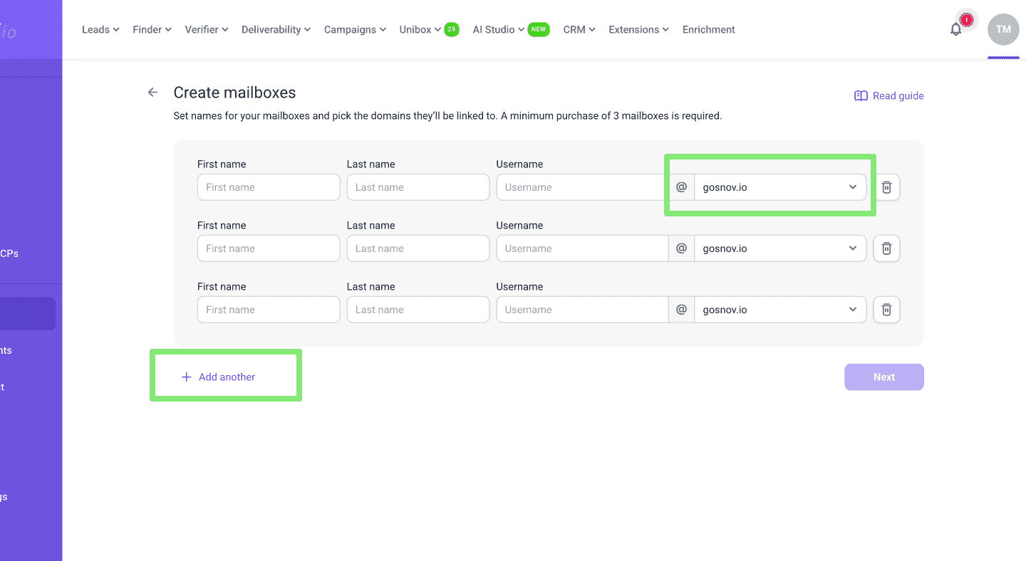 We recommend adding no more than 5 mailboxes to your domain. Otherwise, your ESP may consider your activity as spam, which in turn will hurt your deliverability.