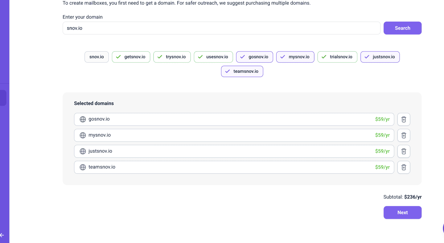At Snov.io, we recommend 3 to 5 mailboxes per domain to strike the best balance between scalability and maintenance costs. This sweet spot gives you enough sending capacity without triggering spam filters.