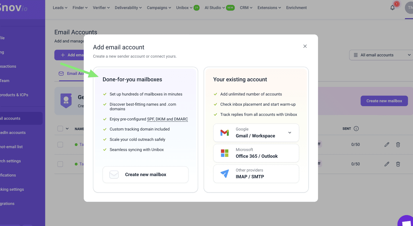 It’s literally a complete email-sending solution with a DFY cold email setup. Instead of spending hours setting up domains, configuring DNS records, and creating mailboxes one by one, you can purchase pre-configured domains and mailboxes directly from your Snov.io dashboard.