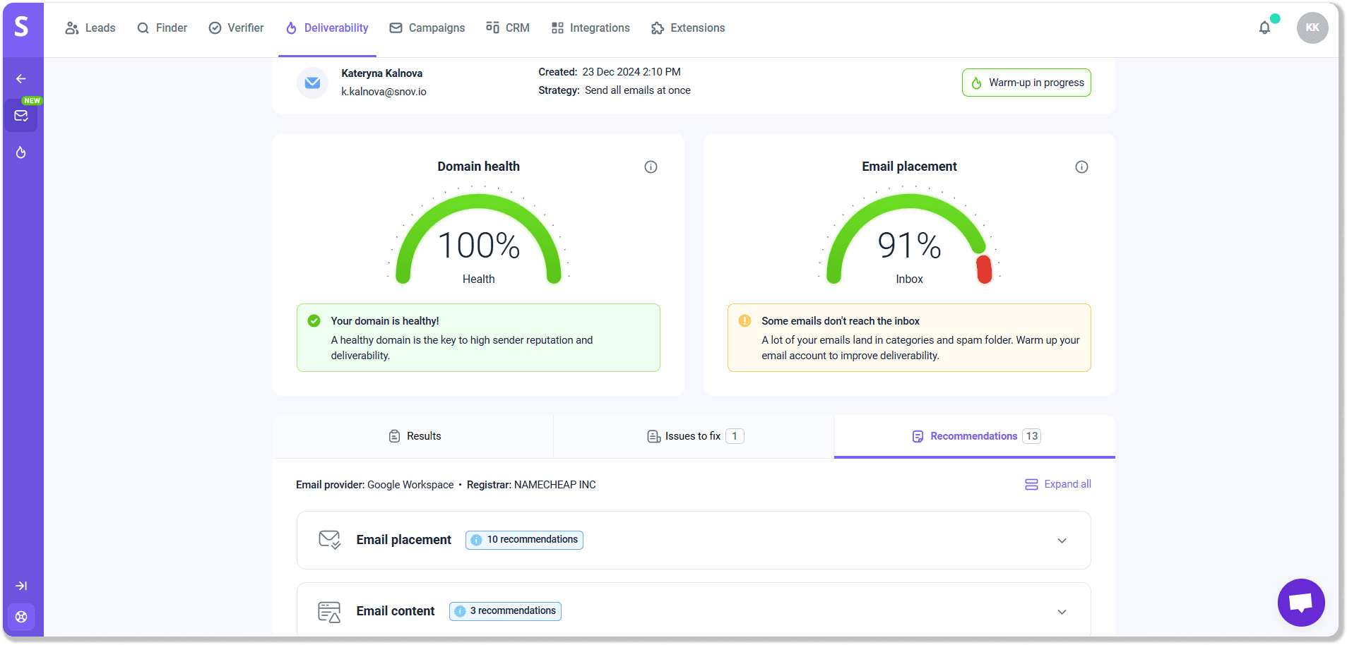 Besides, with Snov.io, you can regularly monitor your inbox placement, warm up an email account, and gain a high sender reputation. The platform provides a strong deliverability toolkit for its users.