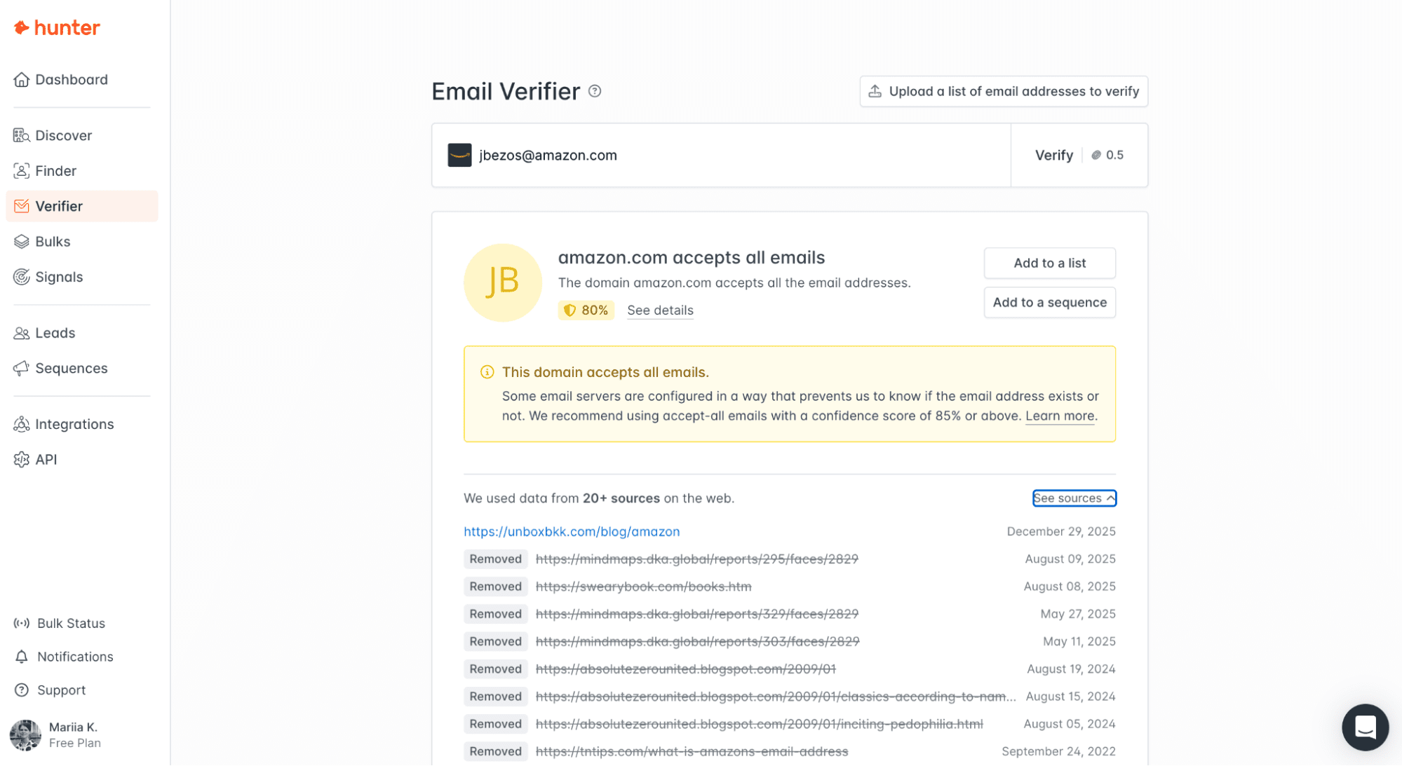 Bulk uploads worked a bit better. Hunter can find emails when provided with names and domains pretty quickly. Still, there were some addresses I couldn’t spot.