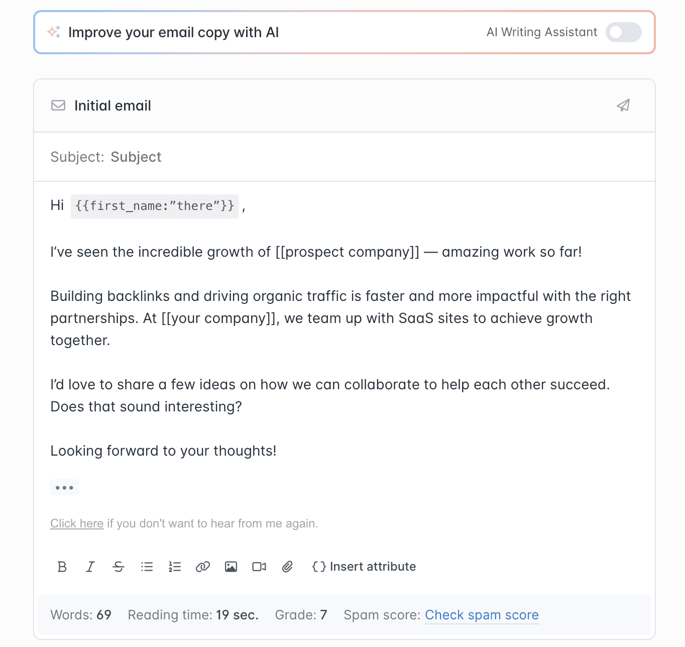 But message-diversification features are very limited on the free plan. You can only enter basic attributes, such as the recipient’s first name, industry, and location. Advanced variables, dynamic content, and AI email-writing features are available, but only on paid tiers.