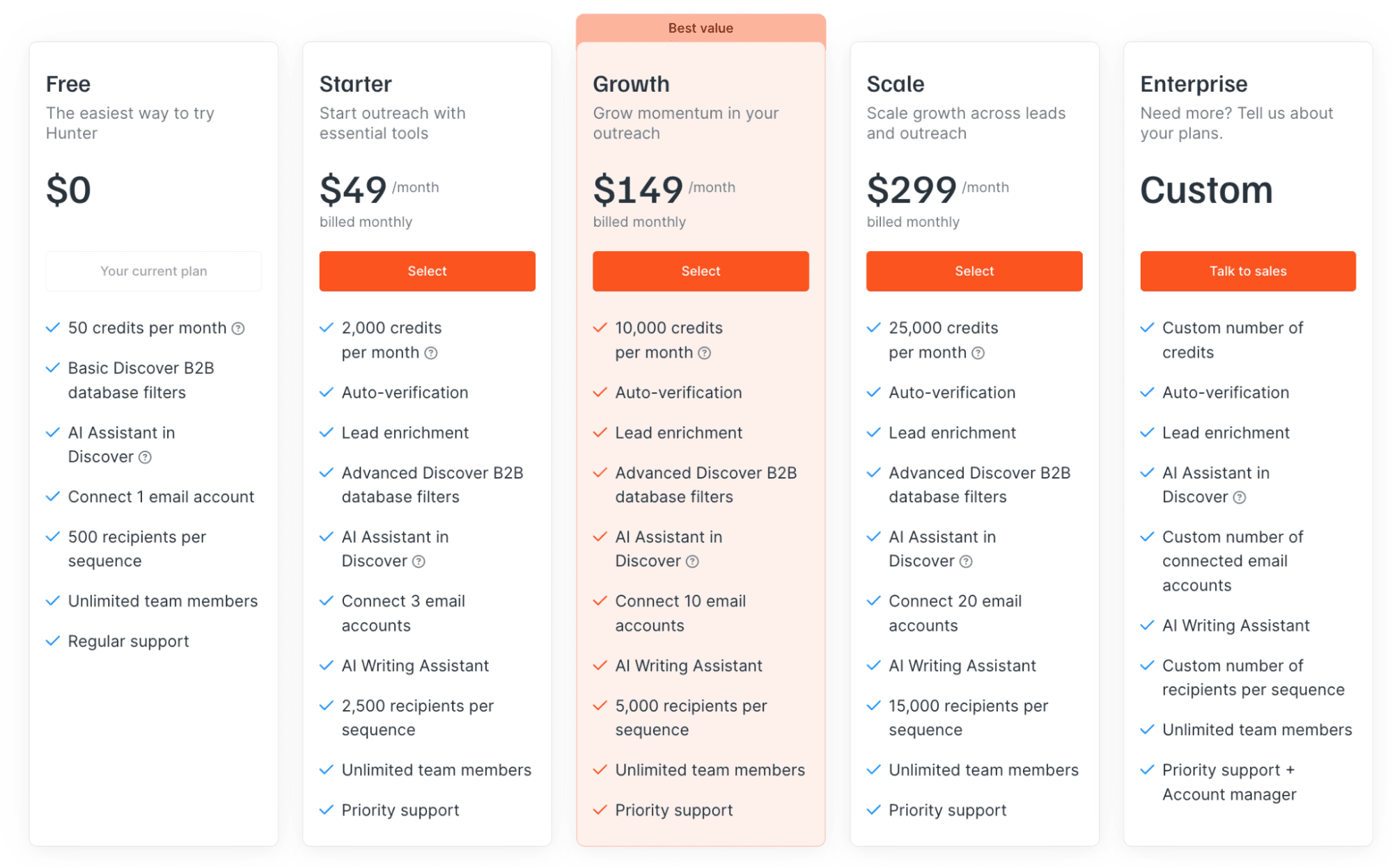 *Prices tend to change; check the official Hunter.io pricing page for up-to-date information.