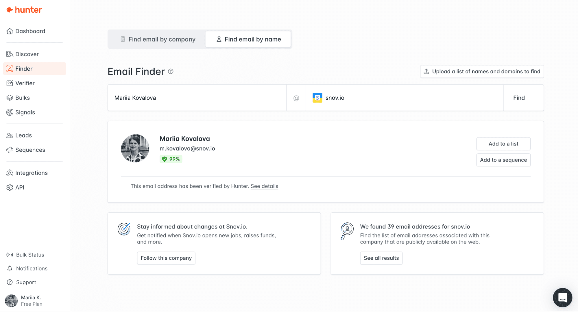 There’s also an option to find email addresses in bulk. The bulk Finder is useful for teams uploading lead lists that contain names, company domains, and social media links (though the latter is optional).
