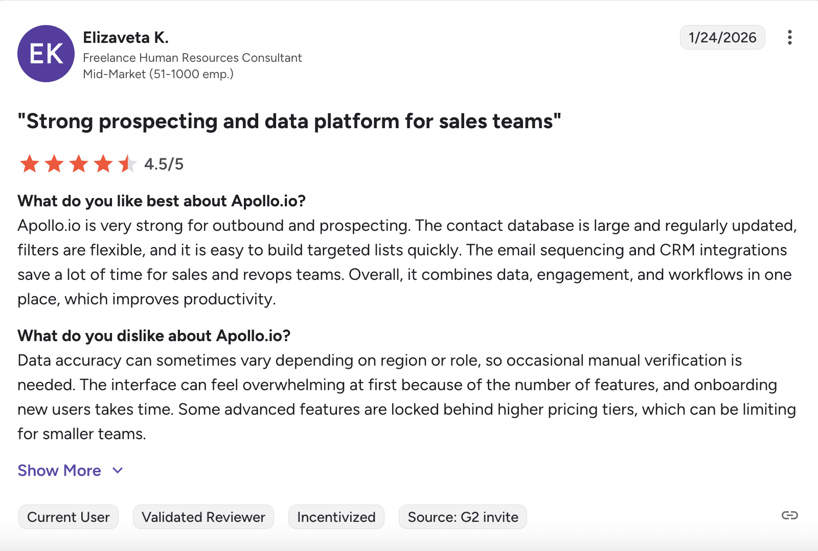 Users like Apollo.io for its large contact database, strong prospecting tools, and helpful CRM integrations that save time. But some note that the platform takes time to learn because of its many features.