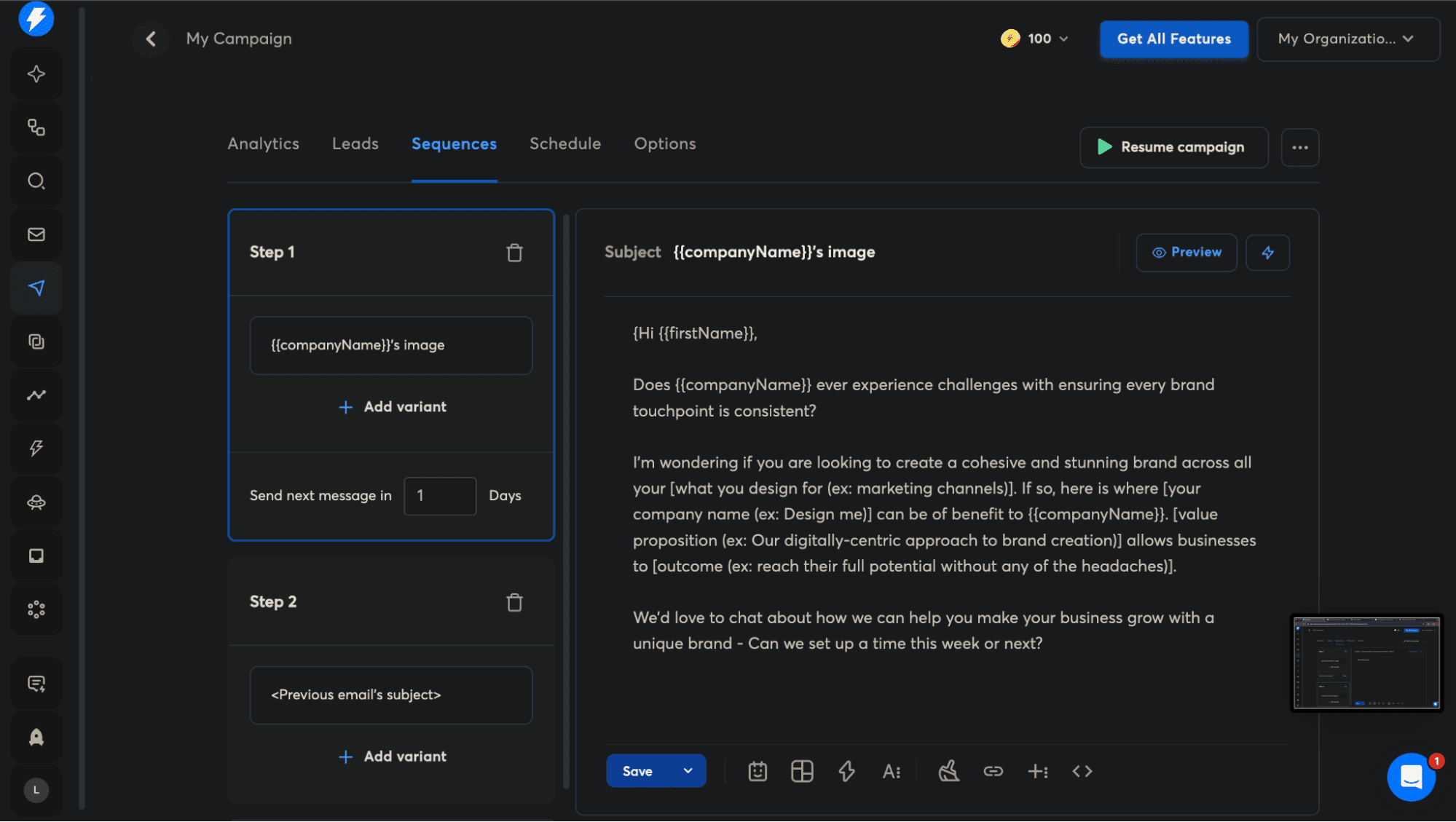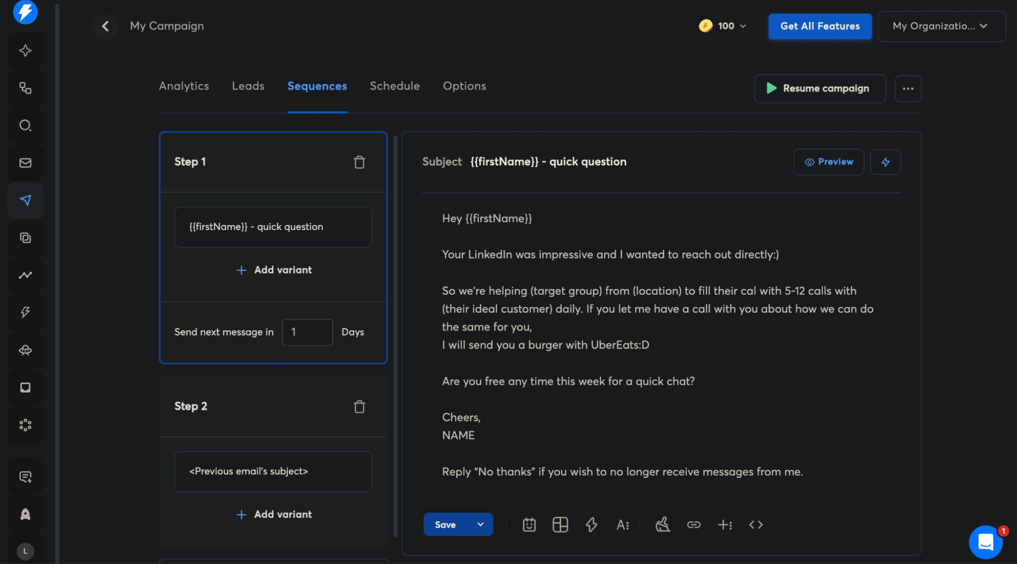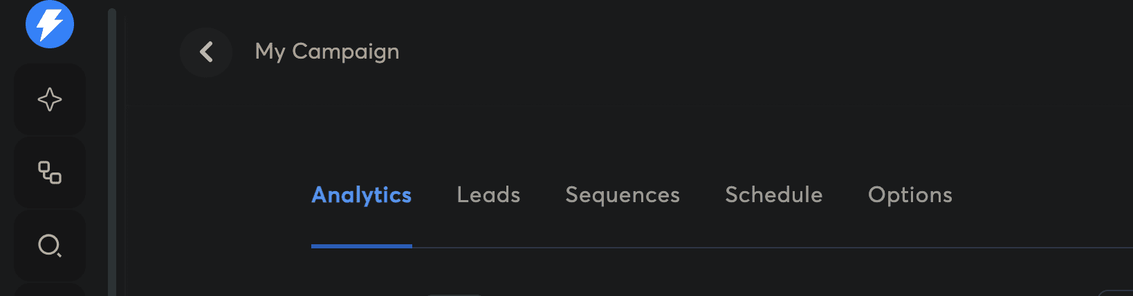 The campaign section covers analytics, leads, sequences, as well as schedule. Here you can test variants, set message delays, add follow-up steps, etc.