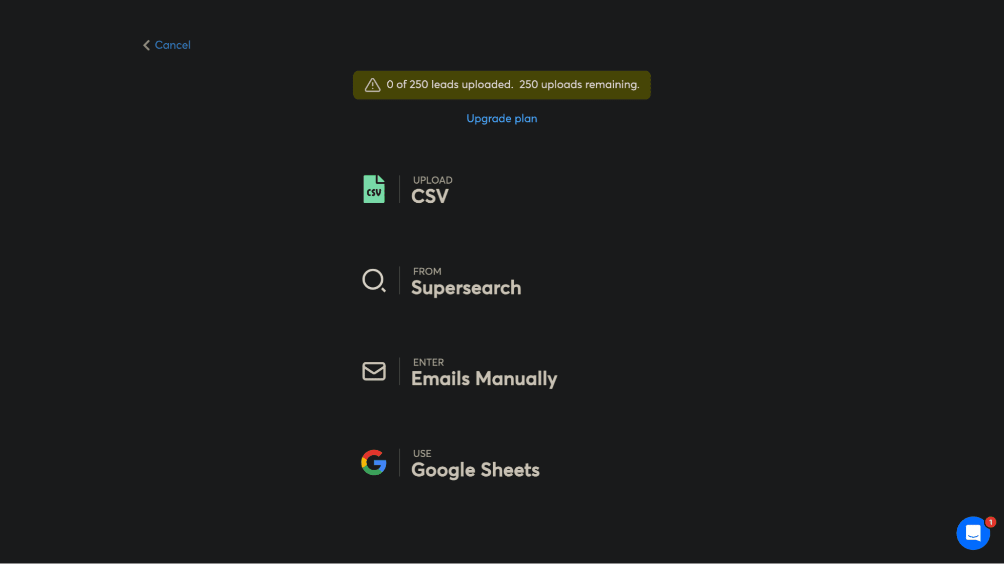 As for adding leads, you’ve got several options to work with. You can upload a CSV file, pull contacts from SuperSearch, enter them manually, sync directly from Google Sheets, or import them from CRMs like HubSpot or Salesforce.