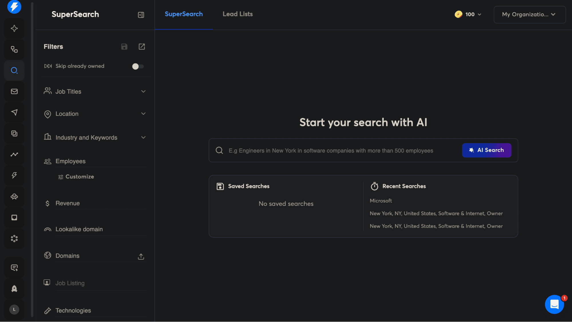 There’s also an AI search function that’s pretty straightforward to use. You simply type what you’re looking for in natural language, something like “Founders of SaaS companies in New York with 50 to 100 employees,” then click AI. But worth noting: free-trial users won’t be able to see the actual results.
