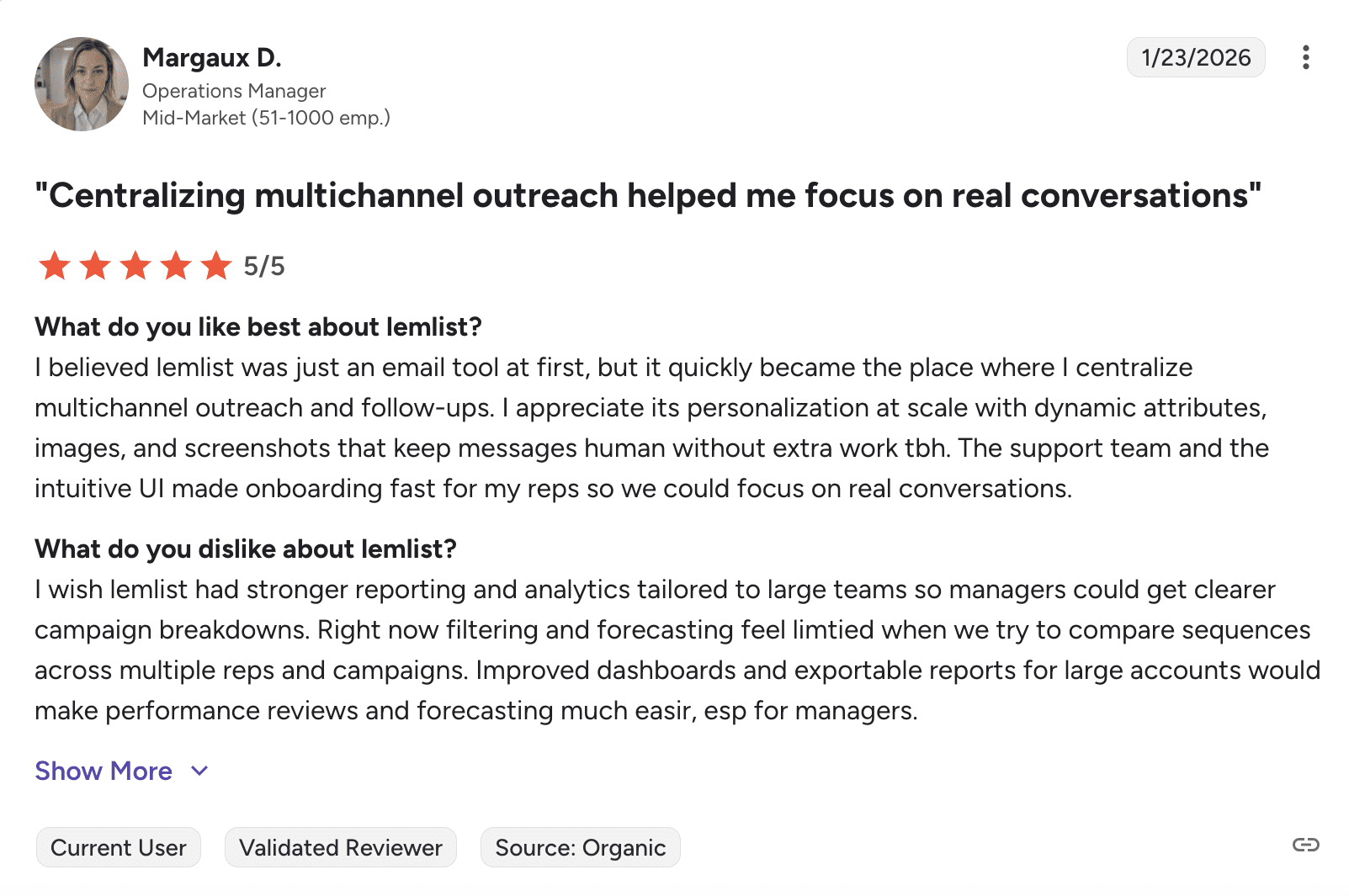 Users like that Lemlist handles multichannel outreach in one place and allows strong personalization at scale. Automated sequences and CRM integrations help keep things organized. But users complain about reporting tools that lack depth for larger teams.