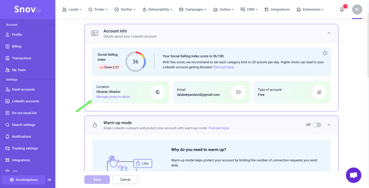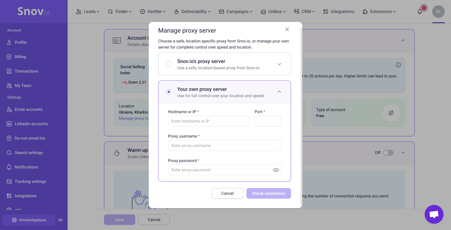 As the updated LinkedIn algorithms pay significant attention to IP addresses, this setup is extremely helpful. In Snov.io, you can assign a dedicated location-based proxy to each account. This prevents the LinkedIn safety features from detecting suspicious IP changes or sudden location jumps that often trigger restrictions.