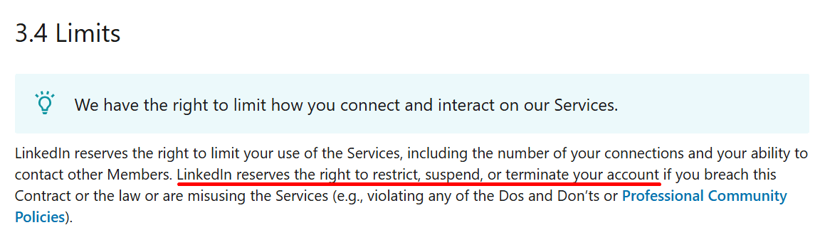 However, such a permanent suspension happens very rarely and occurs only in cases of serious violations of LinkedIn compliance or repeated actions that break platform policies.