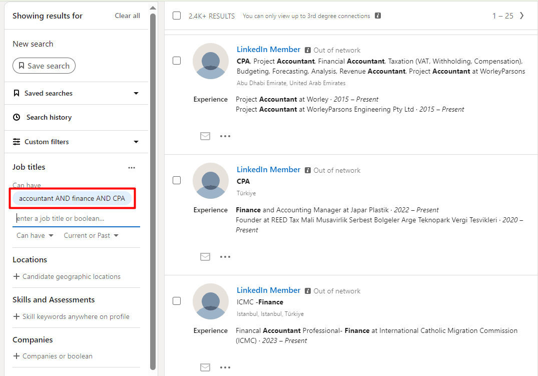 - AND: Use “AND” to find profiles with all the listed terms (e.g., “accountant AND finance AND CPA”).