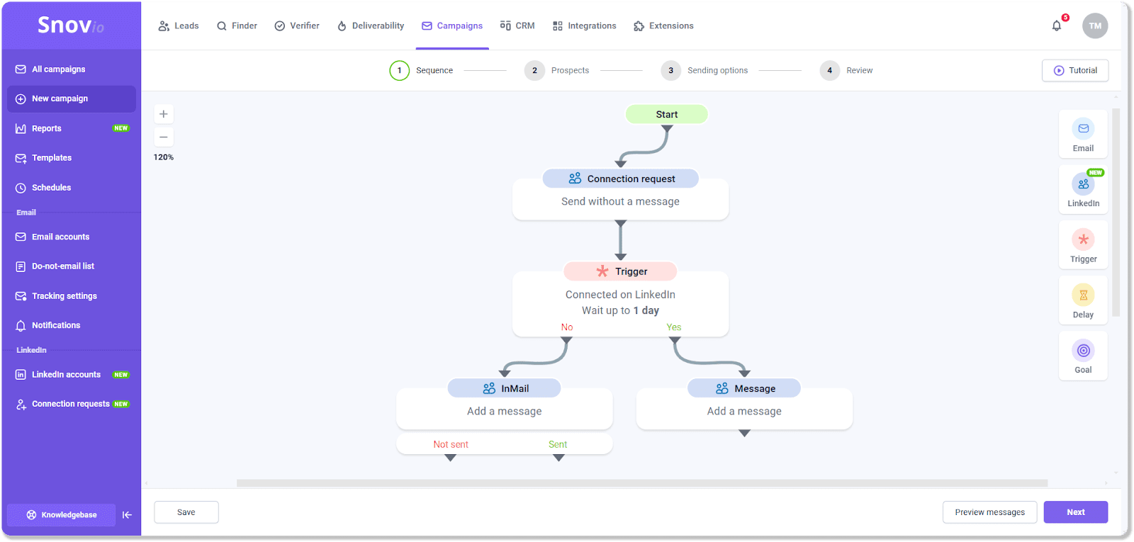 Don’t stick to only one platform. You can do much better with your recruitment by combining LinkedIn and email, ensuring your messages get through. Snov.io will be your reliable partner here, as it allows you to automate both email and LinkedIn interactions within a single campaign.