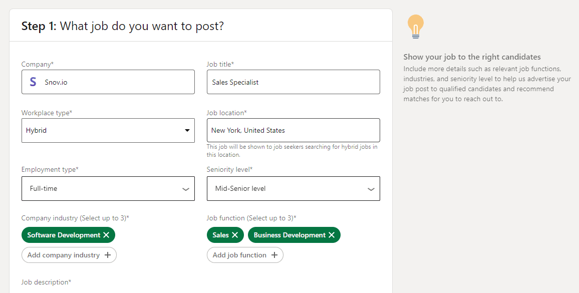 Provide a detailed description of the job functions, industry specifics, and requirements for the seniority level to advertise your job opening to qualified candidates.