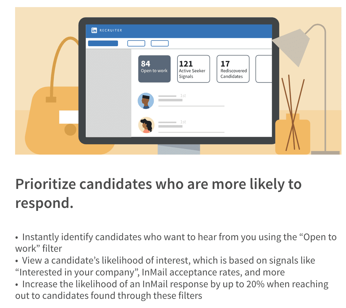 These are special highlights that help you see which candidates are looking for jobs and, hence, are more likely to respond to your messages and InMails.