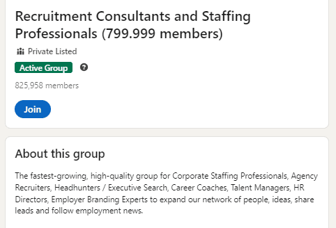 Niche groups tailored to your industry are what you should go for to avoid irrelevant candidates. More so, they can be great hubs for growing your skills while getting valuable recommendations from other recruiting experts, for example: