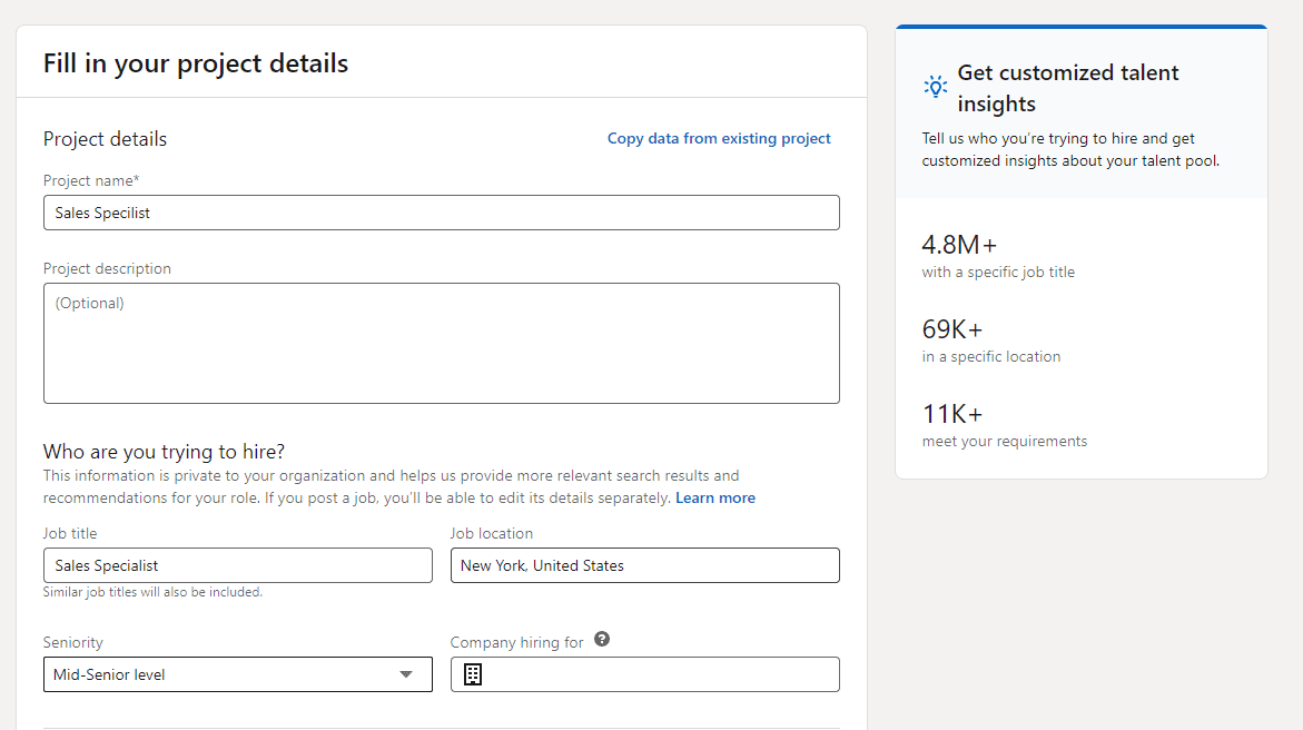 Create a project and see the detailed information about the talent pool within the job position you’re looking for. This allows you to add specific requirements to the job description and narrow down the search.