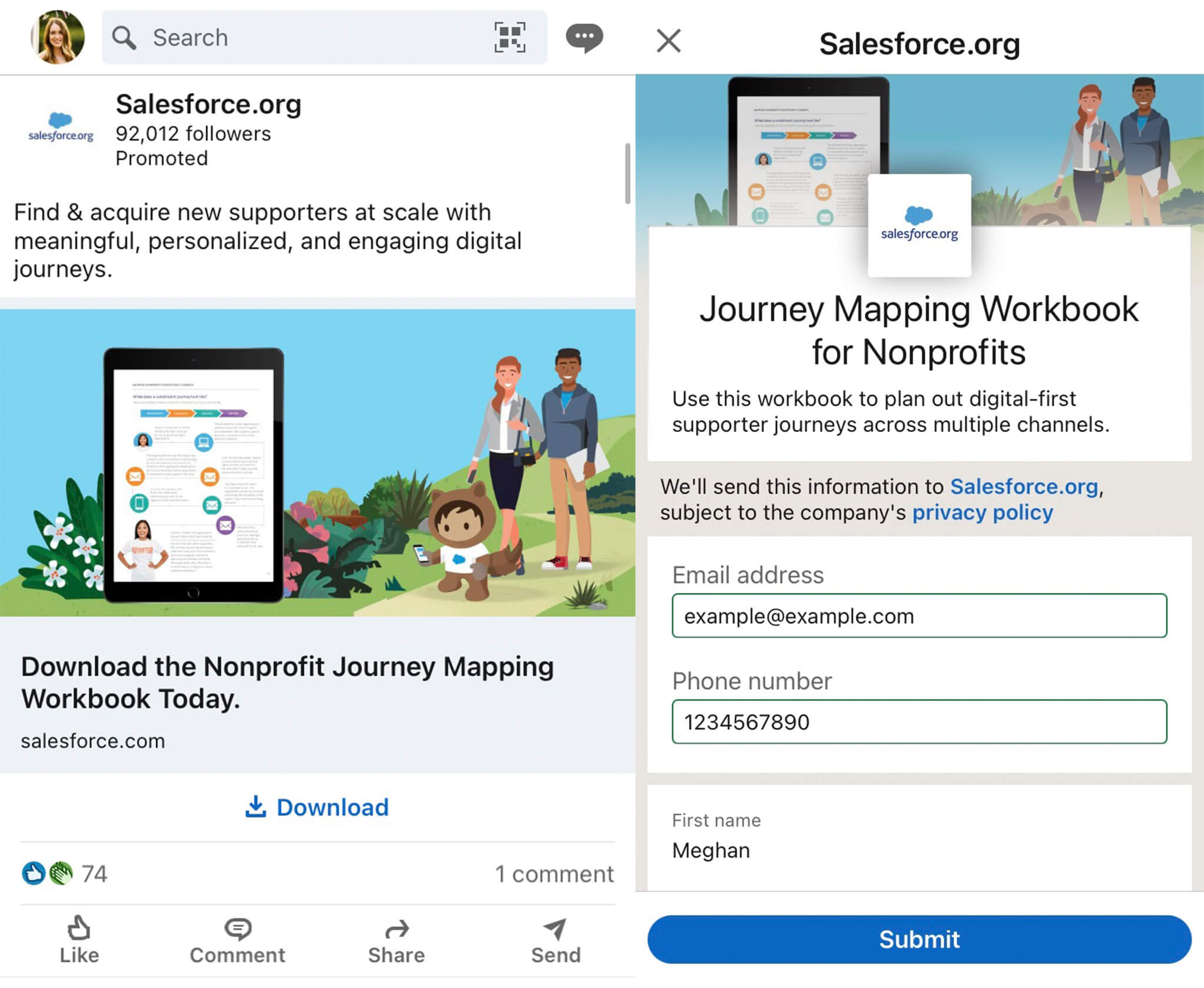 Lead Gen Forms are templates you can attach to ads – whether it’s an image, video, carousel, message, or document. When someone clicks a call-to-action button on the ad, the Form pops up, enabling you to easily collect prospects’ info.