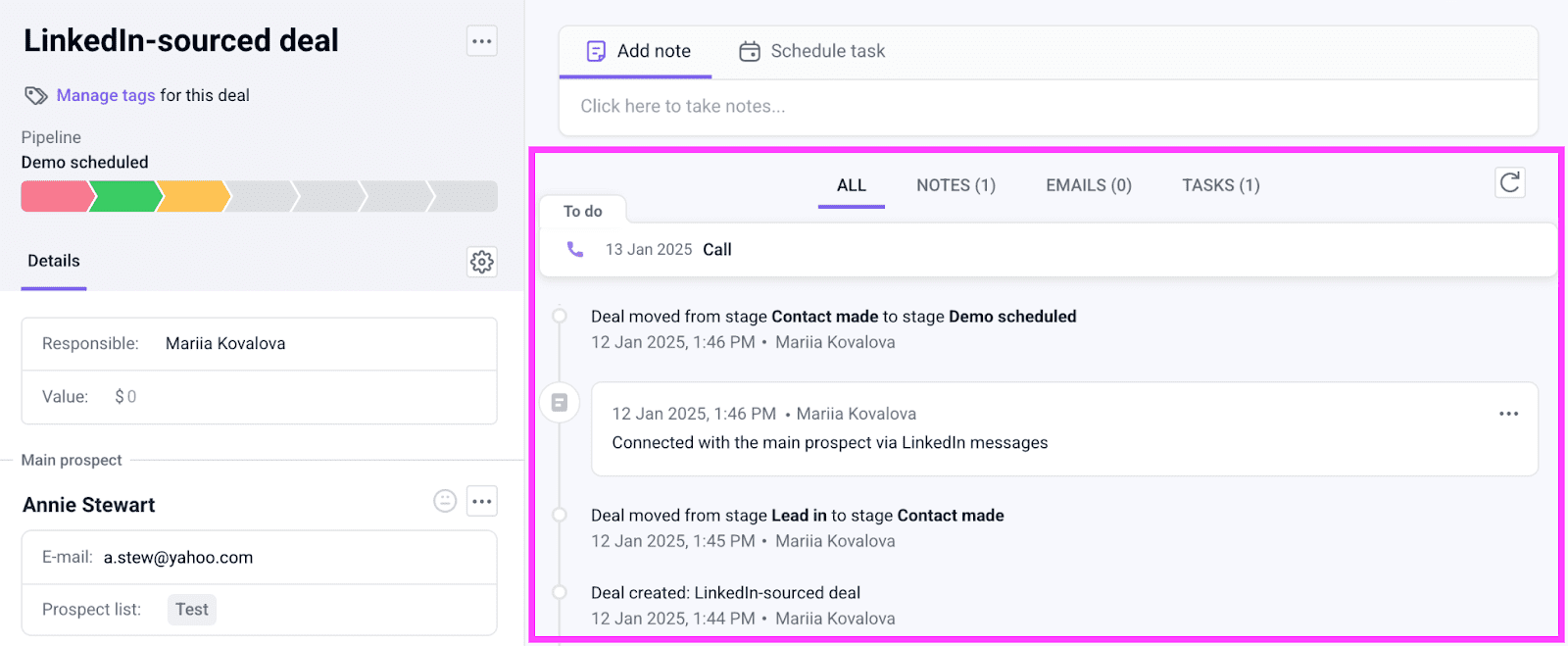 💡Pro-tip: Utilize the integration capabilities of your LinkedIn automation tool to avoid manually transferring the leads from the Campaign Manager to CRM. This way, you’ll avoid mistakes, save time, and keep track of all of your deals from start to finish. For example, the Snov.io CRM allows you to view all actions taken and planned regarding the deal. This way, you’ll never miss an important milestone or let the deal slip away.