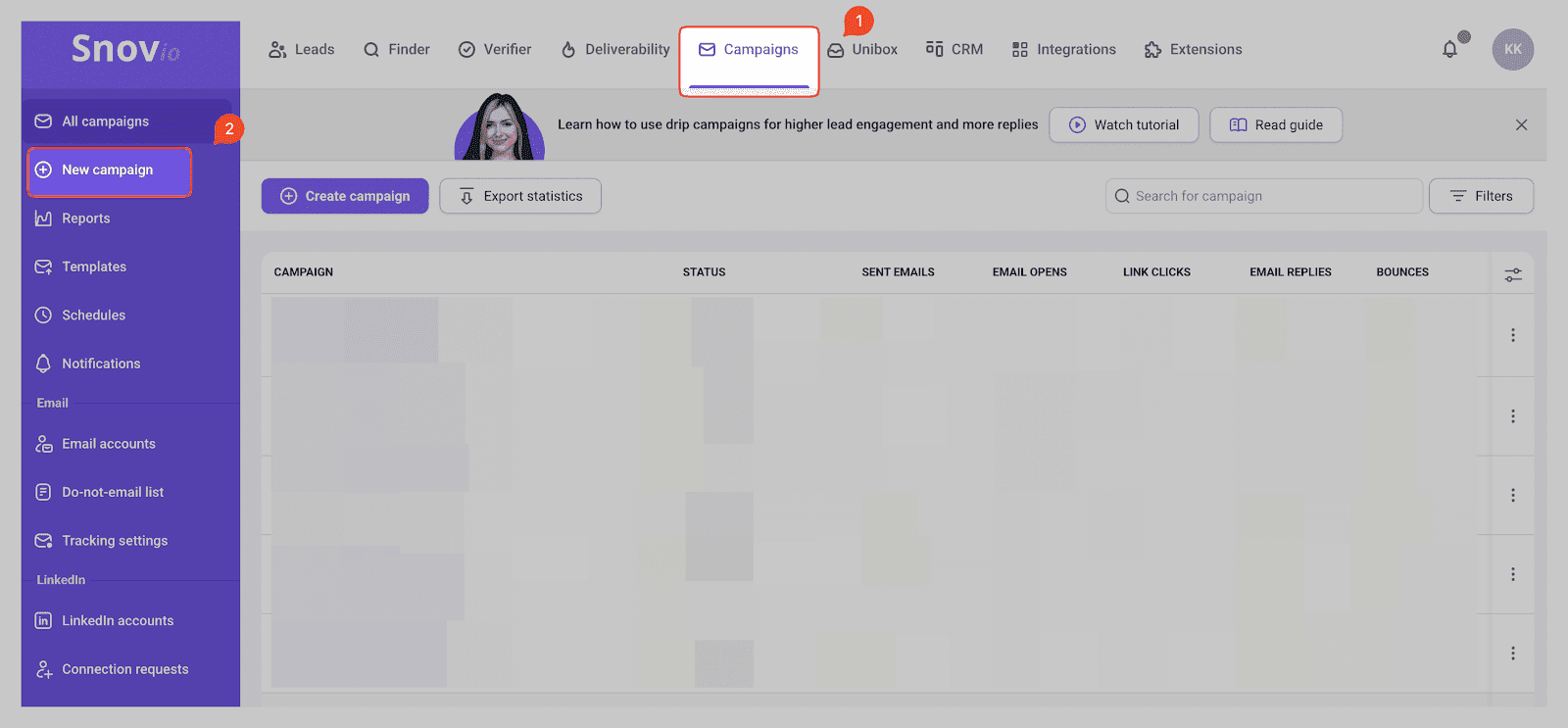 Step 1. Go to the Campaigns tab in your Snov.io account and click “New campaign” on the left-side panel.