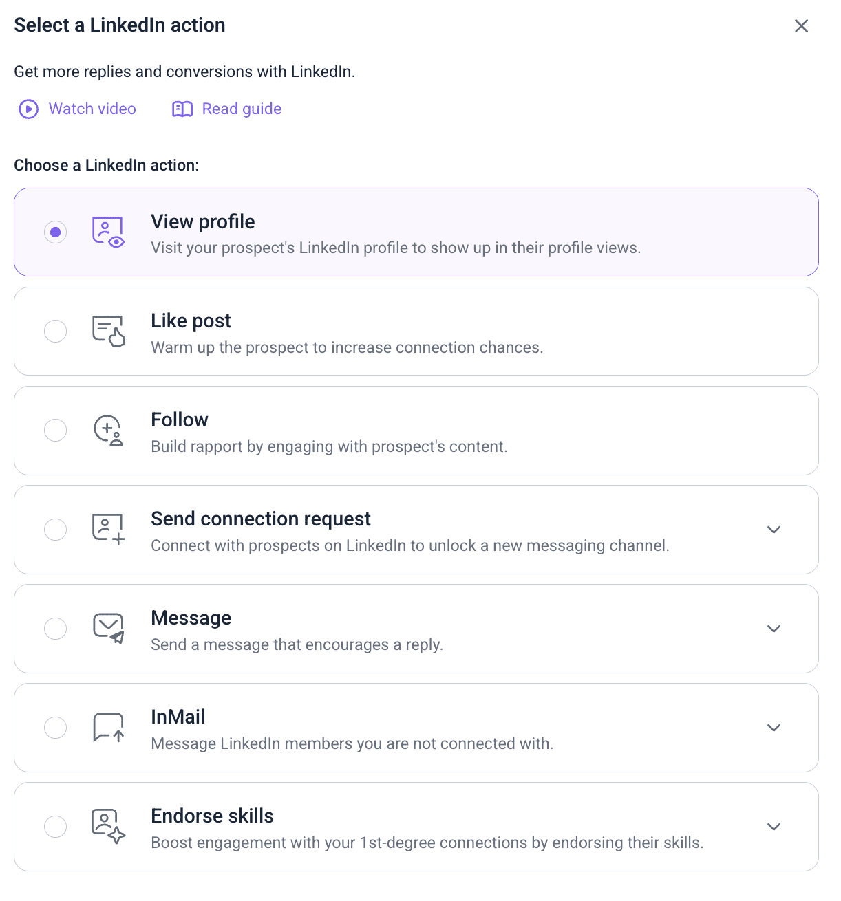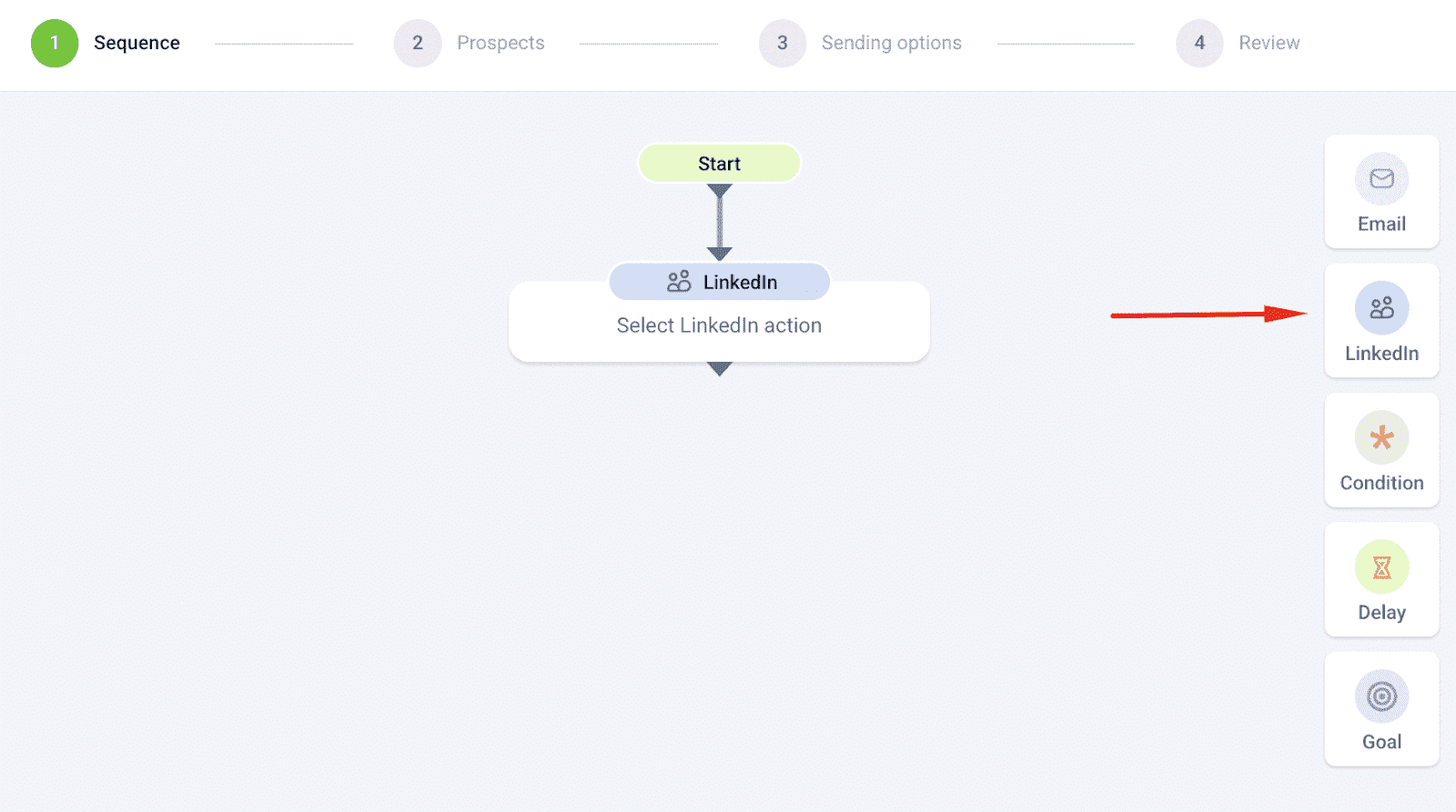 Step 3. Choose an action you’d like to start your sequence with. If you’ve already connected with users on your prospect list, simply start with a message.
