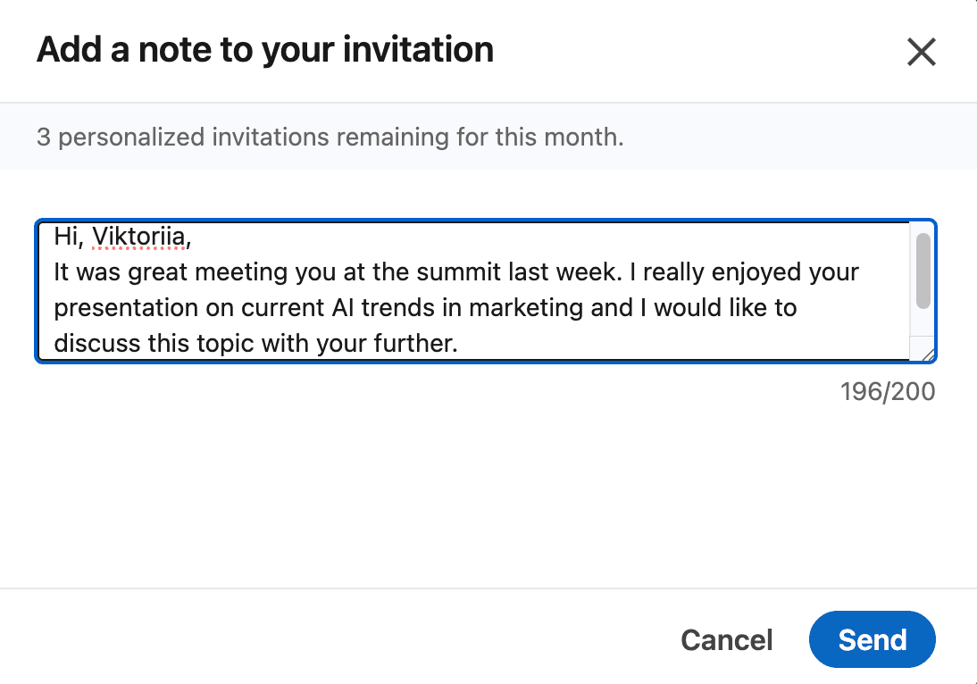 Instead, it would be great to share how you know your lead, mention something significant they did, or include a reference to a common connection. This is how your invitation note would look in the ideal world: