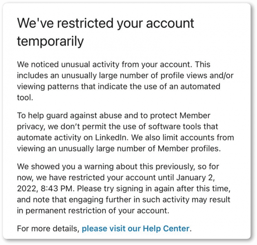 Did this already happen to you? No worries if so! This isn’t a complete disaster yet, just a warning. Your account will be restored shortly. However, if you continue with the suspicious activity, LinkedIn won’t keep you waiting long and will permanently ban your account.