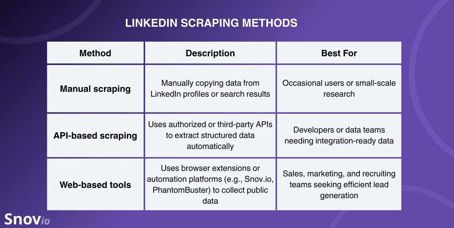 Automated LinkedIn scraper tools are by far the most efficient option. They can quickly gather details like names, job titles, and skills, organizing everything into structured databases. Essentially, they take scattered profile information and turn it into something you can work with.