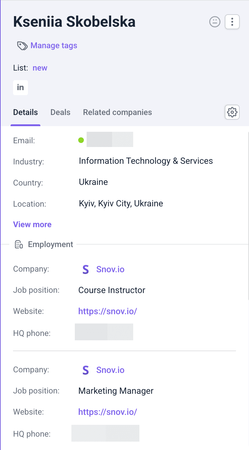 By the way, Snov.io provides a free built-in CRM to help you organize your lead base and manage your sales processes in one place. Collect prospects’ profiles using our LinkedIn scraping tool and keep all your leads in one place to focus on the right deals.
