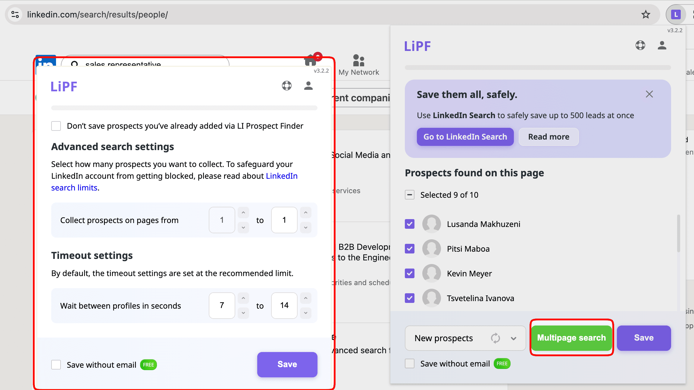 Note: To perform a bulk search, click the Multipage search and adjust your safety settings. Specify the number of pages you want the extension to process, starting from the page you’re currently viewing.