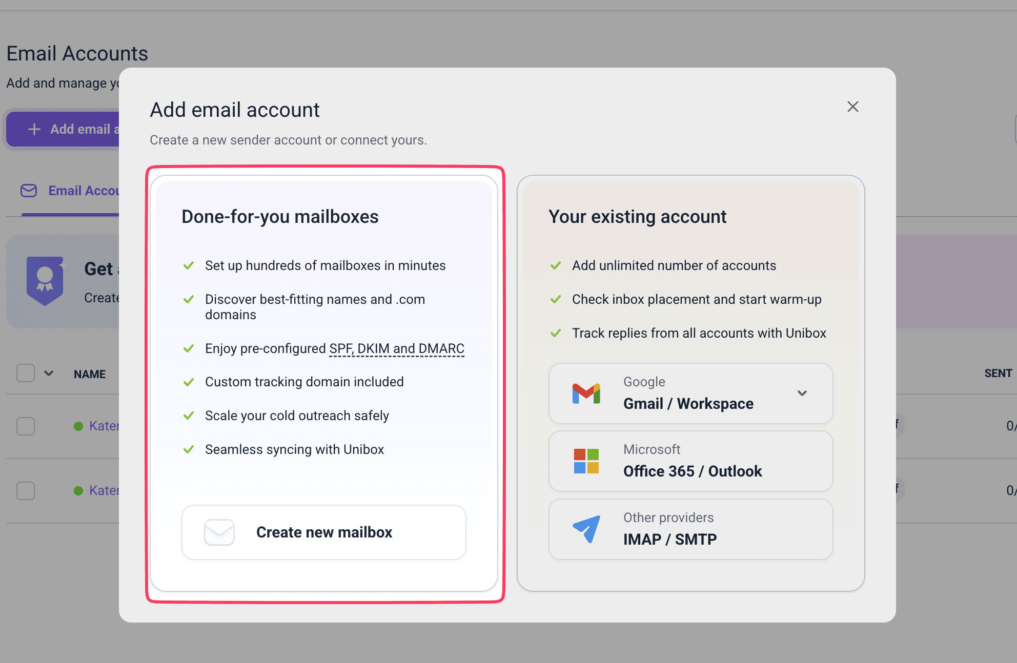 Setting up mailboxes for outreach just got easier and faster! You can now purchase Done-For-You (DFY) domains and mailboxes directly from your Snov.io workspace, eliminating manual configuration.