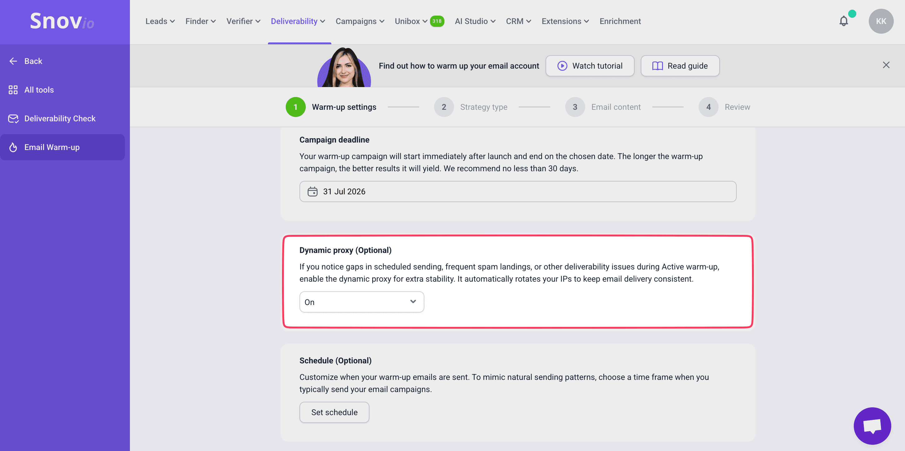 To help you maintain strong deliverability in case of IP-related issues, Snov.io now offers a Dynamic Proxy option.