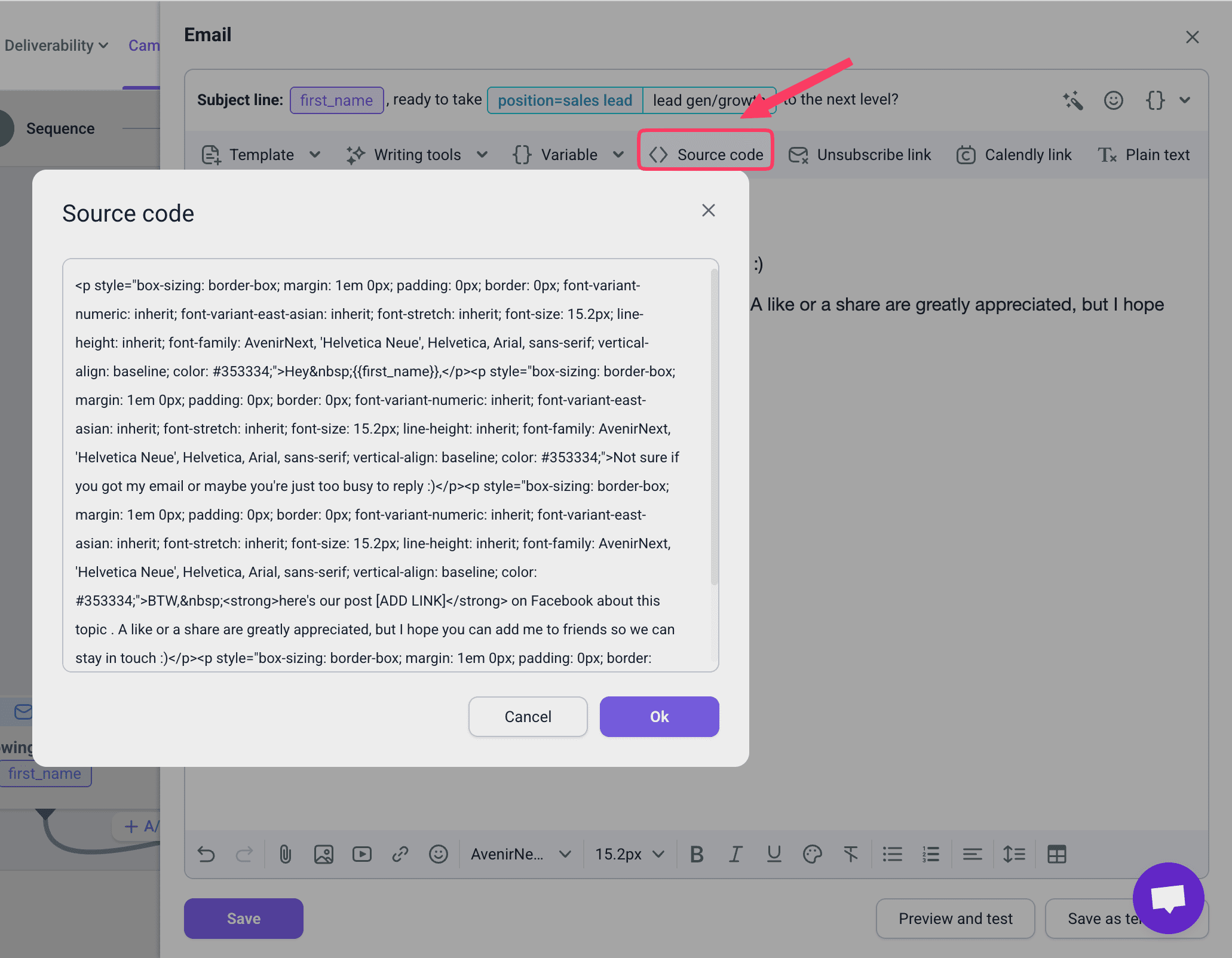 💡Pro tip: Want to keep your original styling? Just paste your HTML template directly into the Source code field in the email editor.