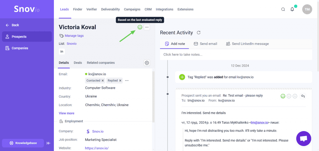 Beyond standard performance metrics, you can also use AI-driven insights to prioritize your outreach efforts. Snov.io provides Sentiment Analysis that uses AI to classify replies based on a recipient’s interest.