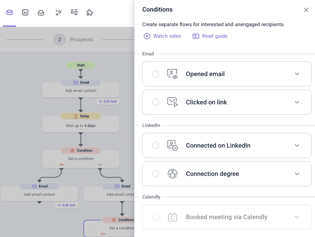 With multichannel sequences, you make outreach more efficient by switching to another channel when one doesn’t get a response. You can also set a condition around a booked meeting via Calendly, so your sequence stops automatically, and the prospect doesn’t receive unnecessary follow-ups.