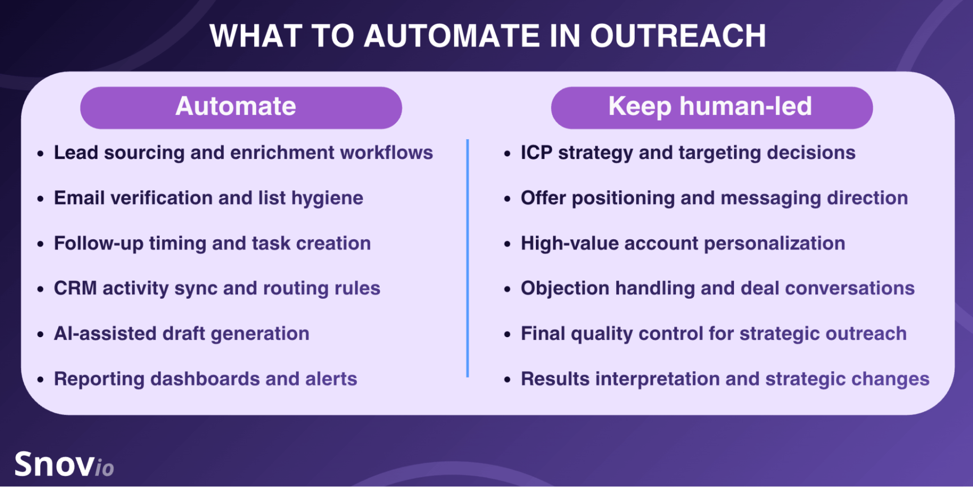 People are better at spotting nuances, so despite the temptation to put everything on autopilot, some parts of outreach can’t run equally effectively without human input. Use the infographic below as a helpful clue on what to automate and what to keep human-led to ensure quality and relevance: