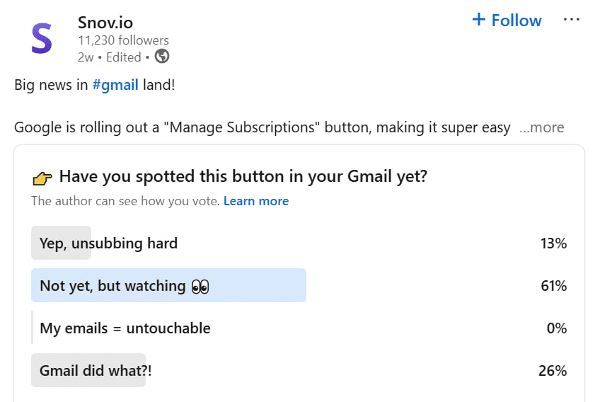 Start by optimizing your company page. Write expert content, share industry updates or valuable resources, and showcase your SaaS product through interesting case studies. You can also run LinkedIn polls or short surveys to boost engagement and get insights into your target audience’s needs or challenges.