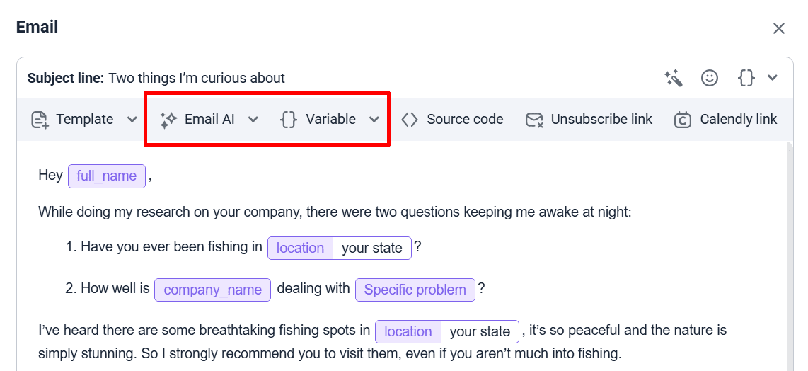 Personalized emails help build a stronger connection and warm your cold outreach, increasing the likelihood of a response. Tailor your messaging to the recipient’s role, interests, challenges, etc. For example, you can reference a recent company milestone or describe how your SaaS solution covers their specific pain points.