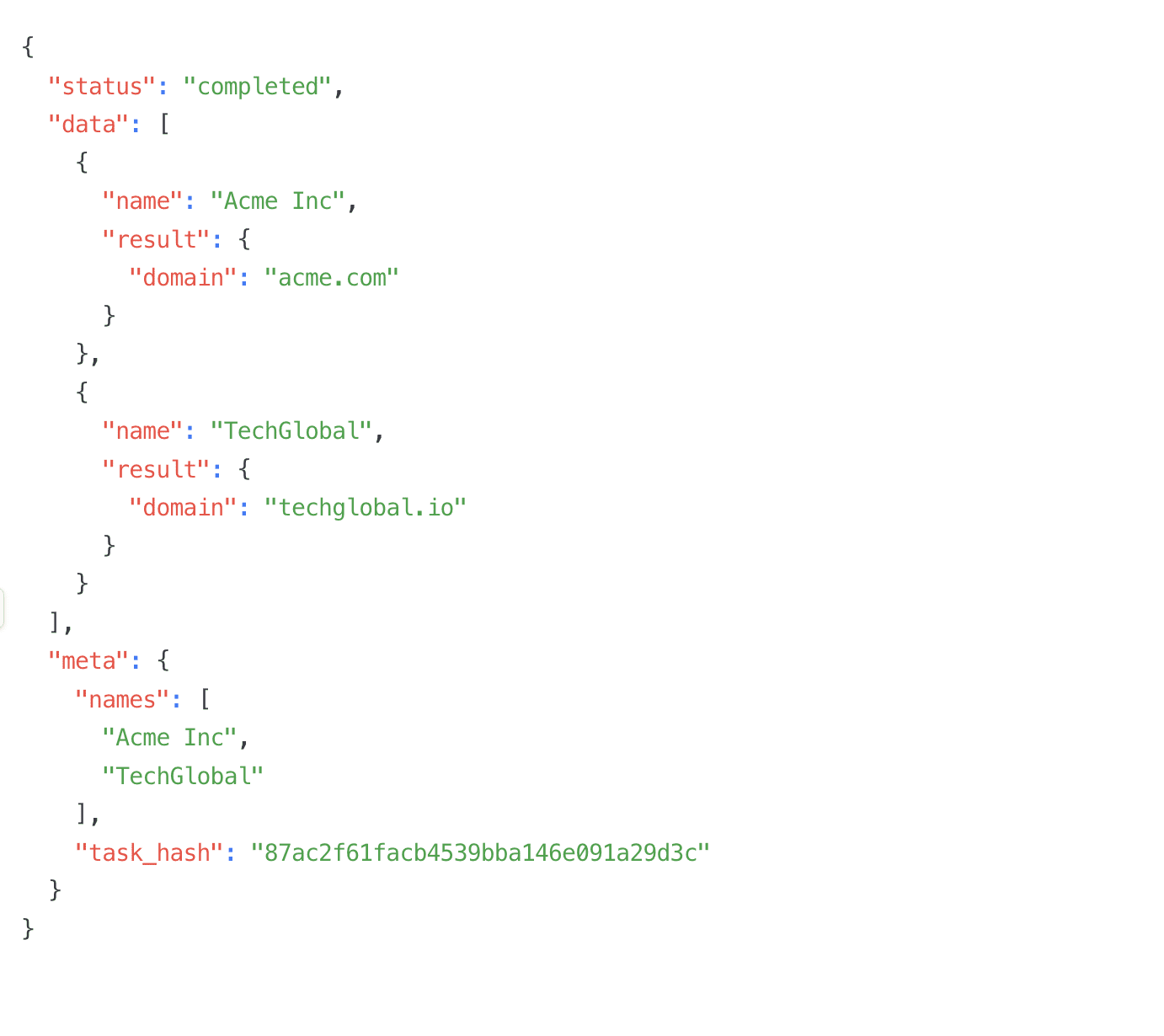A resposta fornecerá um "task_hash": um identificador exclusivo para sua requisição. Você precisará desse ID para obter seus resultados por meio de uma requisição de API de acompanhamento.