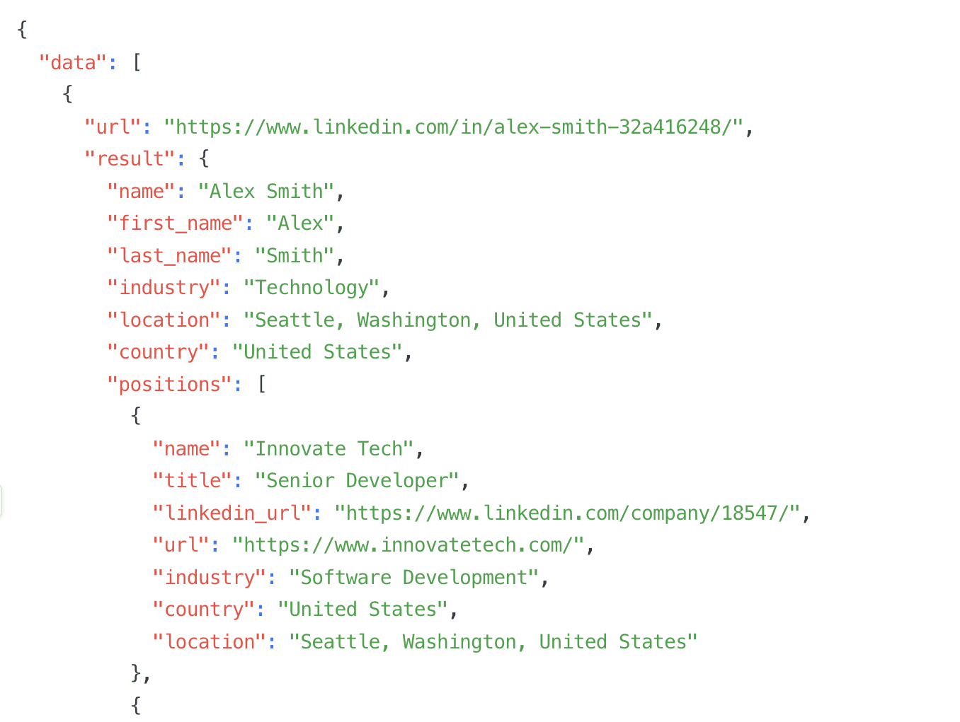 Para cada link de perfil do LinkedIn que você adicionou para enriquecimento, a Snov.io retornará os dados completos para o prospect e a empresa a que ele pertence.