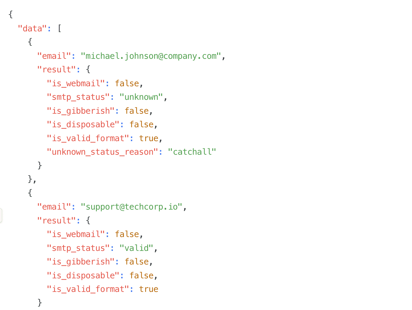 A API de Email Finder suporta busca em massa. Você pode enriquecer até 10 prospects em uma única requisição de API. Nós encontraremos e verificaremos o endereço de e-mail do prospect. A verificação em várias etapas garante que você receba e-mails corporativos precisos.