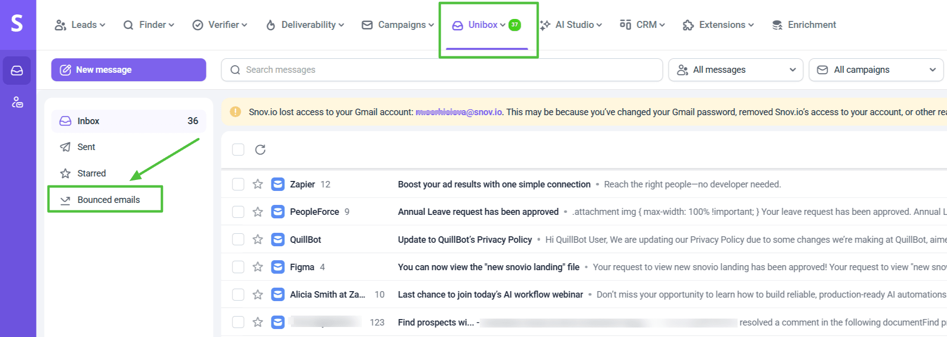 - Todas as mensagens ou apenas as relacionadas aos seus prospects na Snov.io
