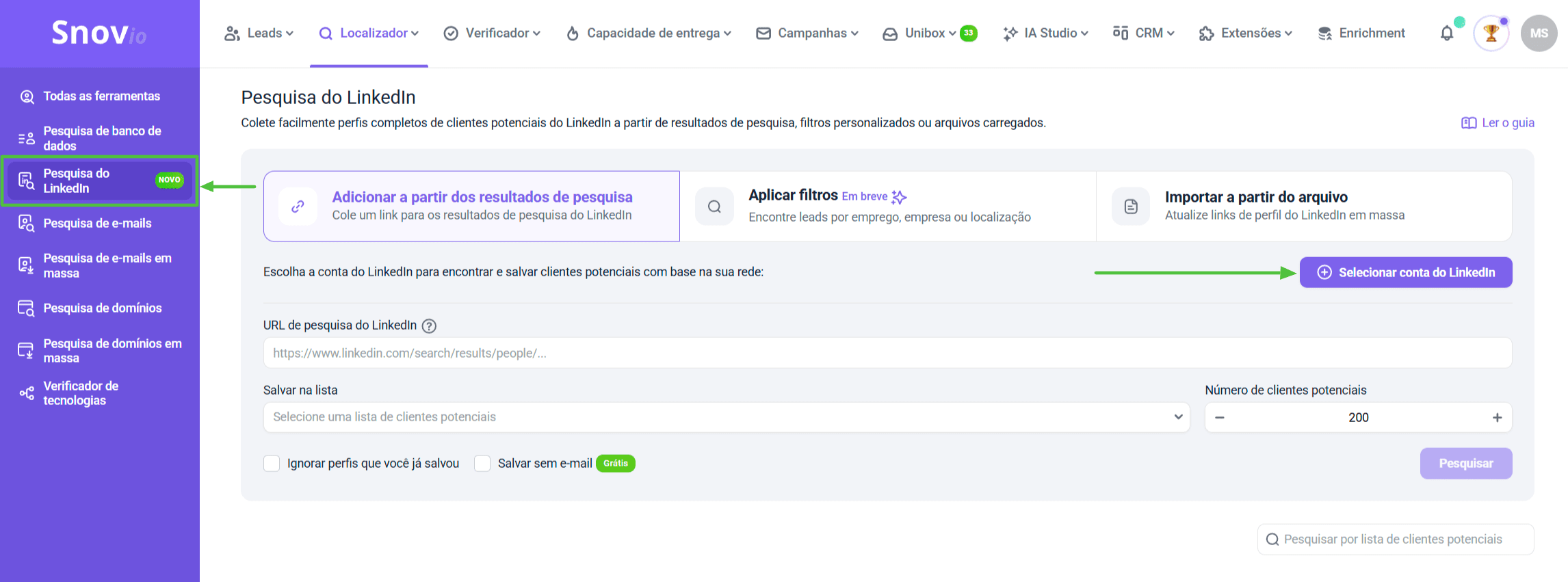 A Busca do LinkedIn complementa essas ferramentas, oferecendo opções avançadas para encontrar leads diretamente no seu painel da Snov.io. Ela permite buscar prospects de duas formas diferentes: