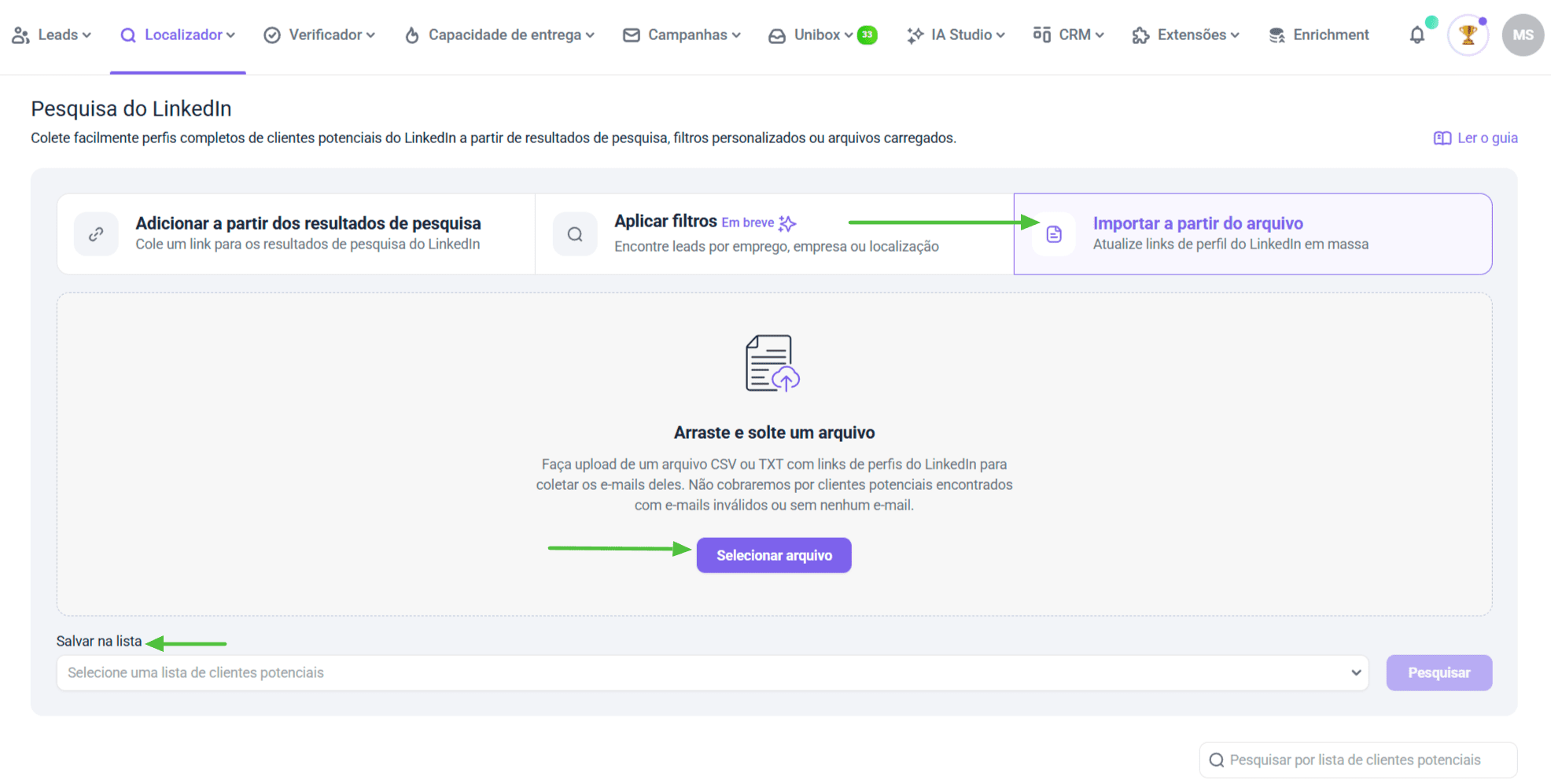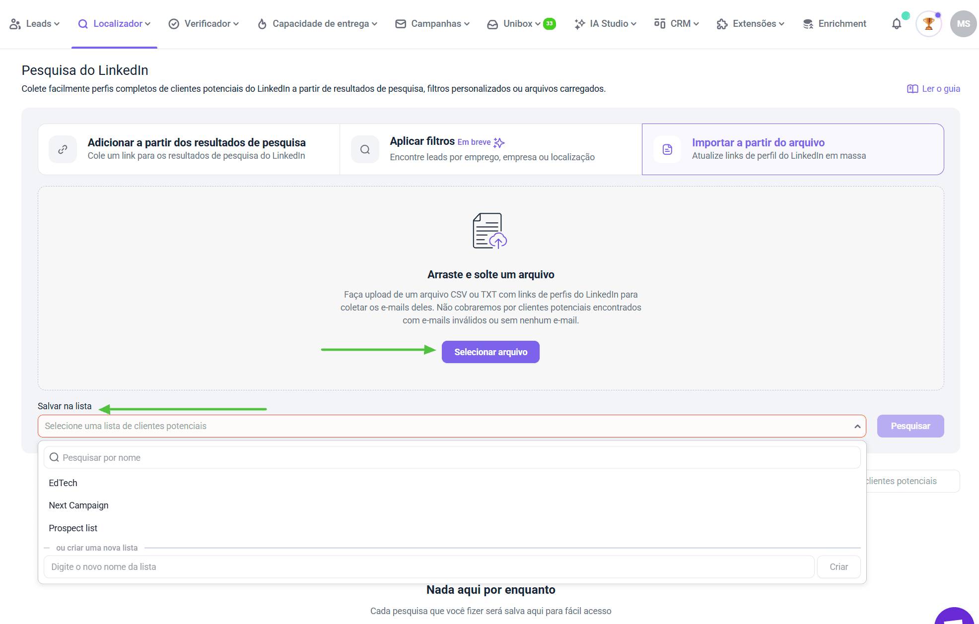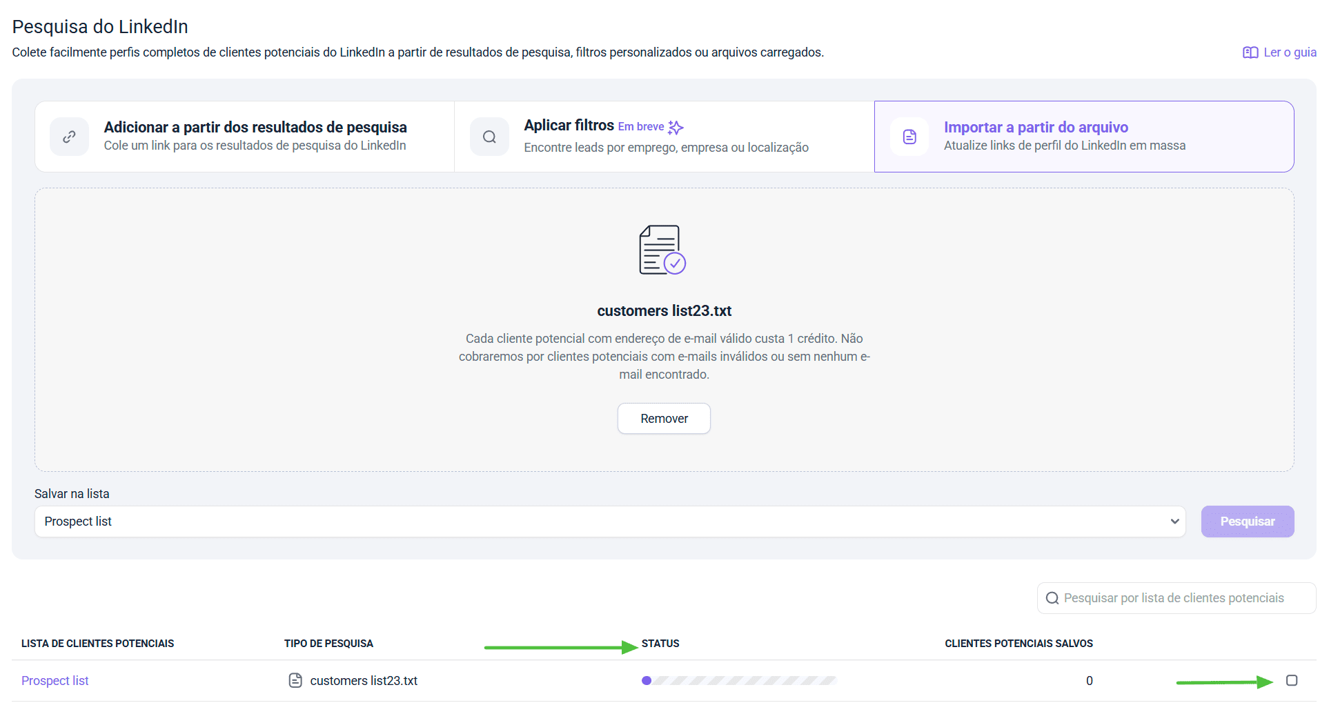 A função de upload de arquivo permite pesquisar prospects em massa, economizando tempo em campanhas maiores.