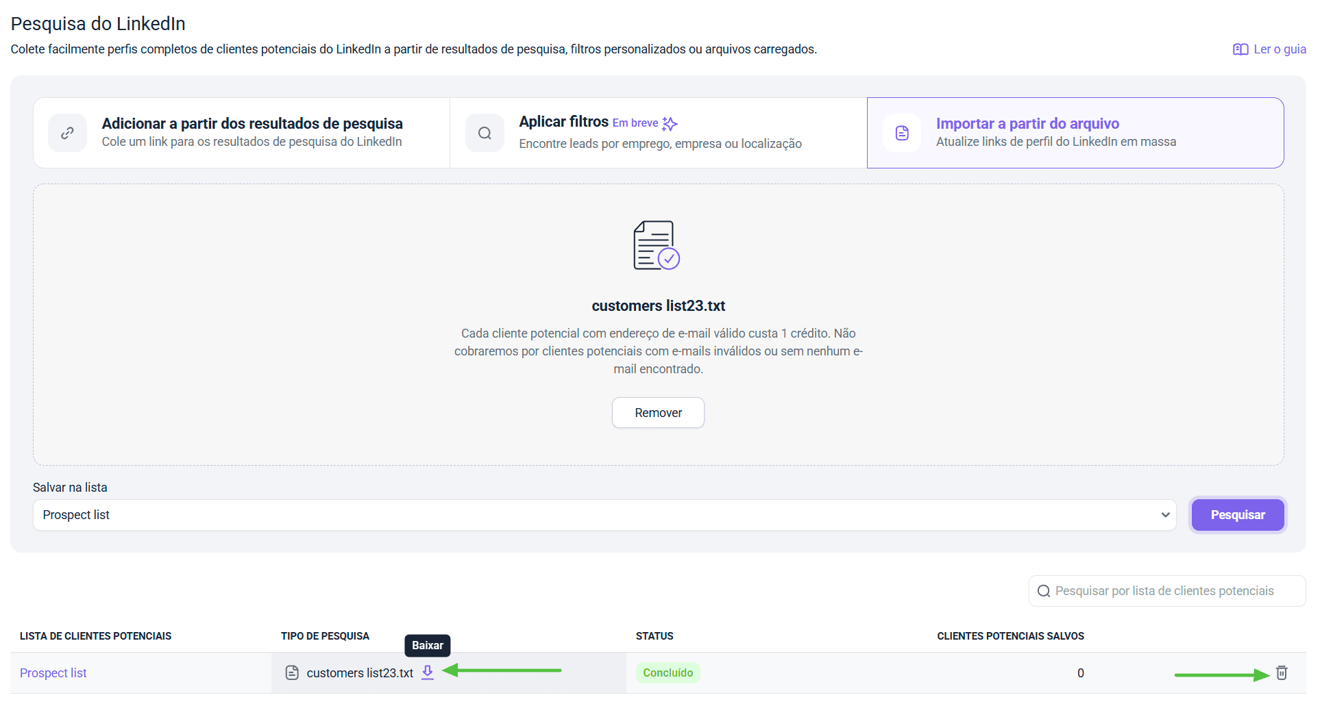 Opção excluir: esse botão remove a importação do seu histórico de buscas. Em outras palavras, sua lista de prospects real permanece segura e apenas o registro da importação desaparece.