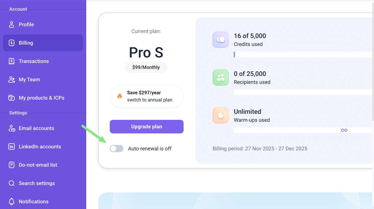 Si no deseas que tu suscripción de Snovio continúe, puedes gestionar tu plan y tus complementos desde la configuración de facturación.