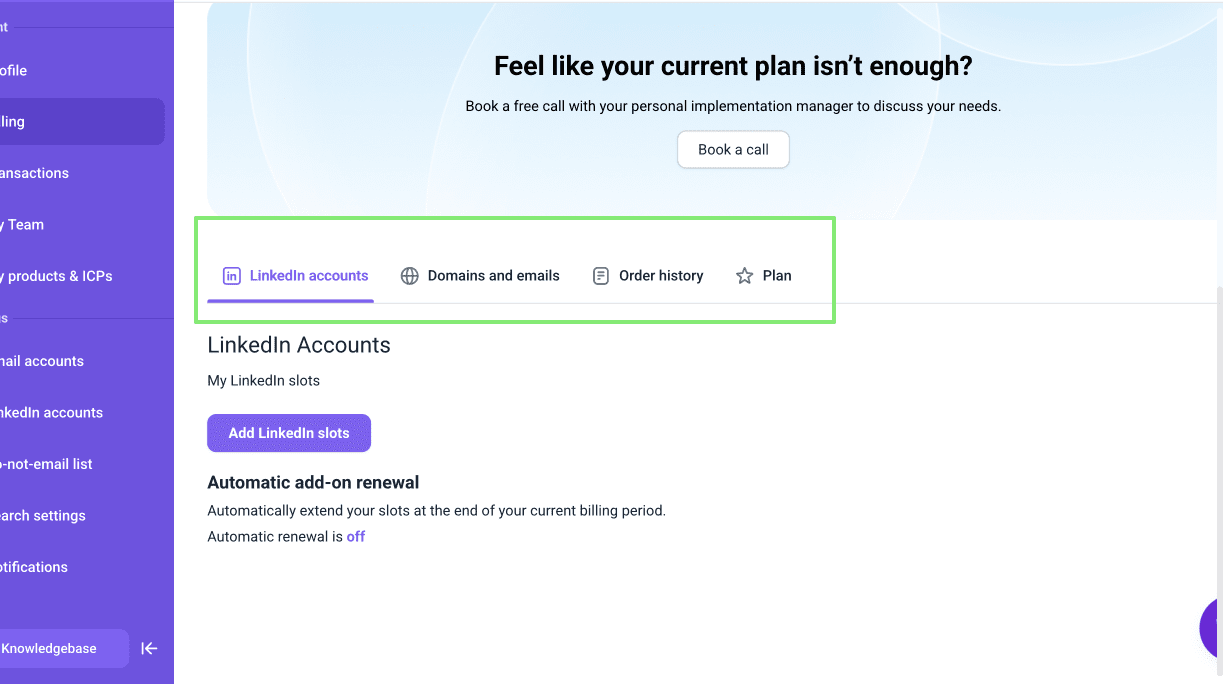 Las pestañas dentro de la sección de facturación muestran todas las suscripciones activas de complementos: cuentas de LinkedIn y buzones de correo listos para usar.