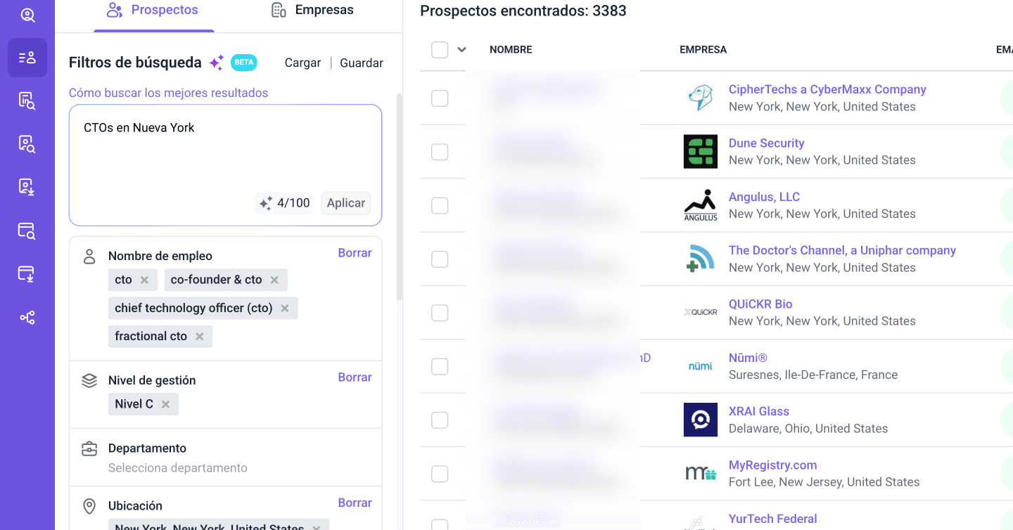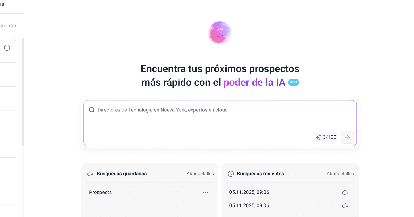 En el campo Búsqueda con IA, describe los prospectos que deseas encontrar. La IA configurará automáticamente los filtros de búsqueda en función de tus criterios.