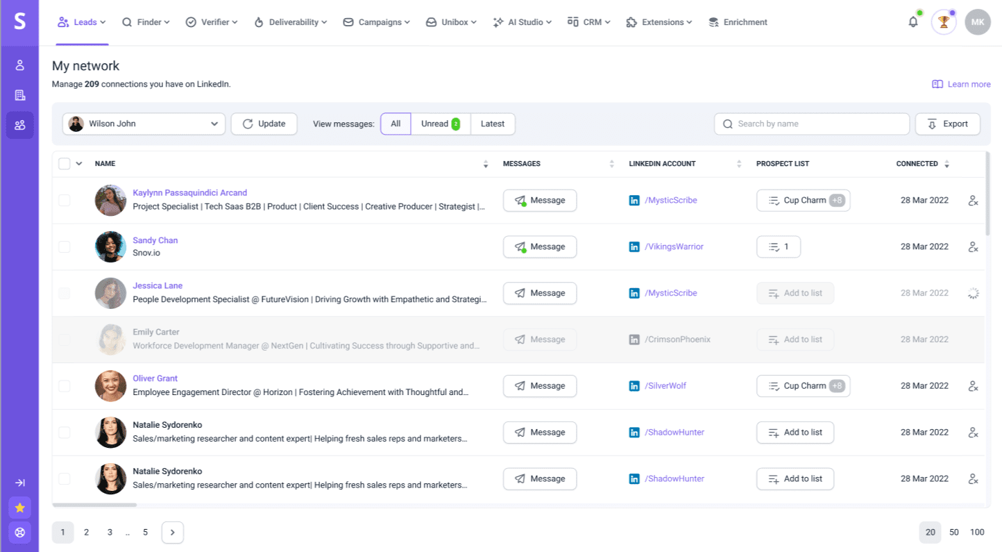 Mi red sincroniza tus conexiones de LinkedIn con Snov.io. Desde un único lugar puedes ver tu red de contactos, enviar mensajes y gestionar tus listas.