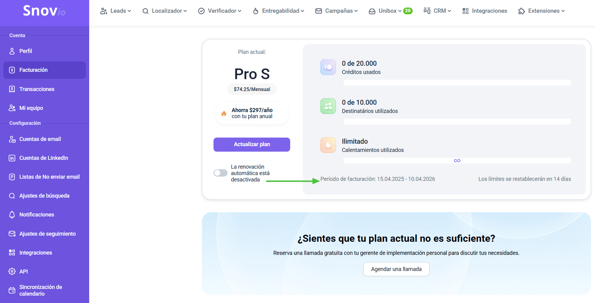 Puedes consultar el período de facturación de tu plan anual en la configuración de facturación. Revisa la fecha en ''Vence el''.